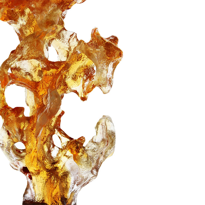 Do ponto de vista da forma, este elegante brinquedo de esmalte colorido é como uma chama ardente ou uma seda dançante, com linhas suaves e dinâmicas. Cada curva e curva são retratadas em detalhes, mostrando uma vitalidade vigorosa. A base preta na parte inferior é lindamente desenhada, complementando o corpo principal do esmalte colorido e desempenhando um bom papel no destaque. O esmalte colorido em si tem as características de clareza cristalina e colorido, e este brinquedo elegante demonstra de maneira desejável essas vantagens do esmalte colorido. A obra é dominada pelo ouro, mostrando um temperamento nobre e elegante, como se solidificasse o brilho do sol.